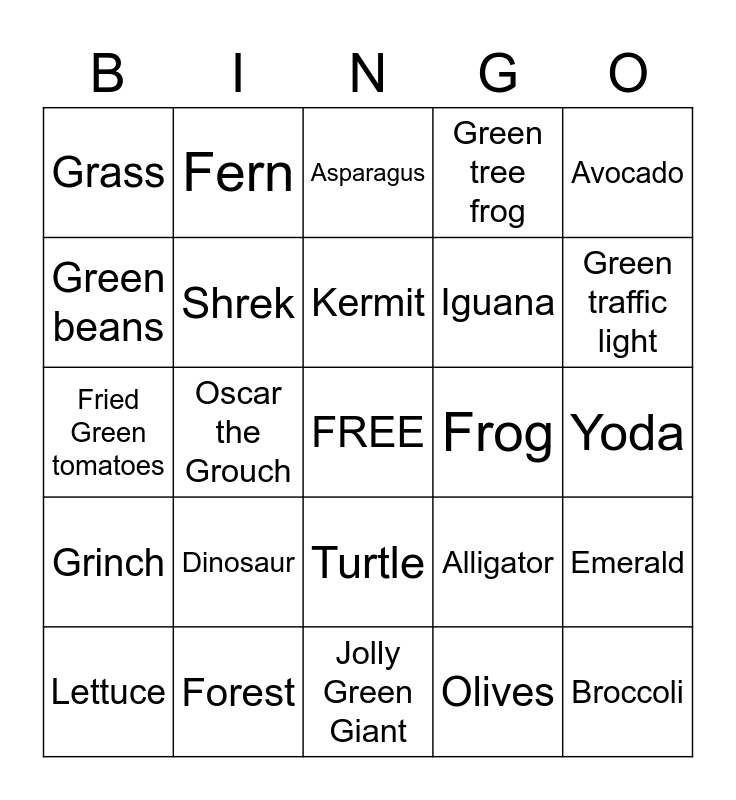 This bingo card has a free space and 24 words: Dinosaur, Forest, Kermit, Lettuce, Avocado, Grass, Green beans, Fern, Frog, Turtle, Iguana, Fried Green tomatoes, Alligator, Emerald, Shrek, Olives, Yoda, Asparagus, Green traffic light, Oscar the Grouch, Broccoli, Grinch, Green tree frog and Jolly Green Giant.