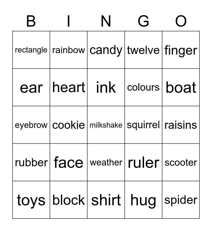This bingo card has 30 words: block, bike, cookie, jump rope, rectangle, candy, heart, weather, squirrel, shirt, raisins, milkshake, hug, spider, boat, zoo, ruler, rubber, face, finger, eyebrow, shoulder, rainbow, colours, ear, twelve, scooter, toys, ink and eye.