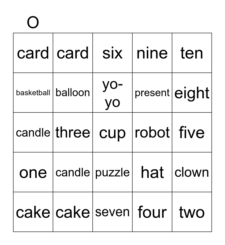 This bingo card has a free space and 24 words: candle, cake, yo-yo, cake, ten, card, basketball, card, robot, puzzle, present, candle, hat, clown, balloon, four, five, six, eight, three, two, one, nine and seven.