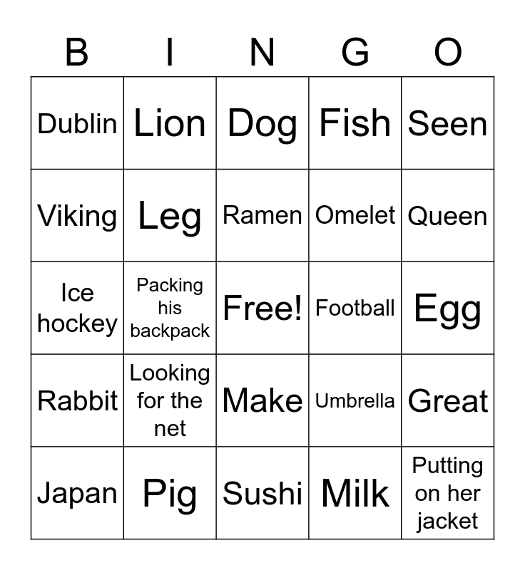This bingo card has a free space and 29 words: Japan, Butter, Packing his backpack, Golf, Dublin, Dog, Leg, Looking for the net, Football, Pig, Egg, Putting on her jacket, Sushi, Milk, Queen, Washing his hands, Make, Rabbit, Seen, Ice hockey, Umbrella, Excellent, Omelet, Viking, Fish, Lion, Great, Ramen and Bagels.