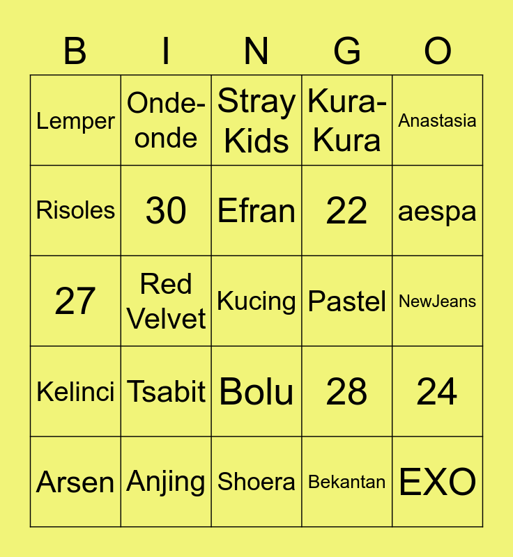 This bingo card has 25 words: Tsabit, Shoera, Efran, Arsen, Anastasia, Lemper, Risoles, Onde-onde, Pastel, Bolu, 22, 27, 28, 24, 30, EXO, NewJeans, Stray Kids, aespa, Red Velvet, Kucing, Anjing, Kelinci, Kura-Kura and Bekantan.
