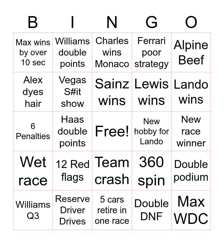 This bingo card has a free space and 29 words: Williams Q3, No RB, Mer, Ferrari on podium, Haas double points, Surprising Monza win, Max wins by over 10 sec, Charles wins Monaco, Vegas S#it show, 12 Red flags, New hobby for Lando, Reserve Driver Drives, New race winner, Max WDC, 5 cars retire in one race, Double DNF, Lando wins, 1st lap crash, Team crash, Wet race, Alpine Beef, 6 Penalties, 360 spin, +10 sec Pit stop, Lewis wins, Alex dyes hair, Ferrari poor strategy, Williams double points, Double podium, Sainz wins and Rookie gets points.