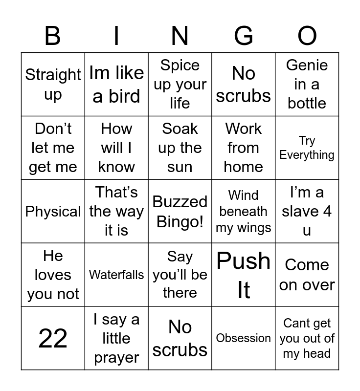 This bingo card has a free space and 67 words: Cest La Vie, Wannabe, Just a girl, Come on over, Complicated, You were meant for me, Im like a bird, Candy, Soak up the sun, If I could turn back time, Say you’ll be there, What a girl wants, I’m a slave 4 u, Genie in a bottle, Miss independent, Don’t let me get me, That’s the way it is, Straight up, Big girls don’t cry, Work from home, Waterfalls, He loves you not, No scrubs, Obsession, Drivers license, Pretend to be nicec, Waiting for tonight, Butterflies, Try Everything, That don’t impress me much, Cant get you out of my head, Mamma Mia, Survivor, Umbrella, We cant stop, 22, Like a virgin, Push It, Physical, Im so excited, I think we’re alone now, How will I know, Wind beneath my wings, Lets hear it for the boy, Conga, Tell it to my heart, Pappa don’t preach, I say a little prayer, Groove Is in the heart, Believe, Spice up your life, You drive me (crazy), Cant fight the moonlight, Express yourself, Hollaback girl, No scrubs, Baby one more time, Promiscuous, Gun powder & lead, This one’s for the girls, Travelin Soilder, Man I feel like a woman, Whose bed have your boots, Strawberry wine, Heads Carolina, Tails California, It’s all coming back to me now and My heart will go on.