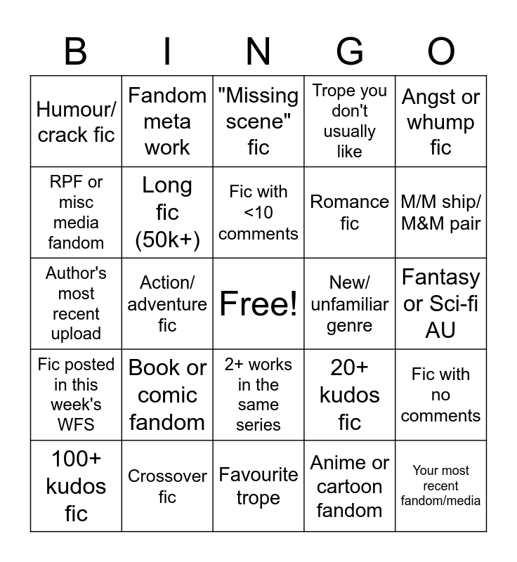 This bingo card has a free space and 53 words: Your first fandom, Your most recent fandom/media, Video game fandom, Anime or cartoon fandom, Book or comic fandom, Movie or TV show fandom, Fandom meta work, Your favourite fic, RPF or misc media fandom, <10 kudos fic, Long fic (50k+), Fic under 1k, Fic with no comments, 20+ kudos fic, 50+ kudos fic, 100+ kudos fic, Fic with <10 comments, New/ unfamiliar genre, Favourite genre, Angst or whump fic, Action/ adventure fic, Mystery/ crime fic, Romance fic, Humour/ crack fic, Alternate Universe fic, Crossover fic, Hurt/ comfort fic, Favourite ship/ platonic pair, New/unfamiliar ship/ platonic pair, M/M ship/ M&M pair, F/F ship/ F&F pair, M/F ship/ M&F pair, Poly ship/ group & tag, Sibling relationship, Parent-child relationship, Friendship fic, Trope you don't usually like, Favourite trope, "Missing scene" fic, Fandom blind, Modern AU, Mythology or Historical AU, Fantasy or Sci-fi AU, Favourite kind of AU, AU that's new to you, 2+ works in the same series, Multiple works by same author, Author's first upload, Author's most recent upload, Fic posted in this week's WFS, Fic written for Monthly Prompt Challenge, Fic recommended on the sub and Subreddit author you haven't read before.