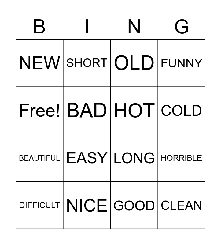 This bingo card has 16 words: NICE, HORRIBLE, OLD, NEW, BEAUTIFUL, SHORT, LONG, GOOD, Free!, BAD, DIFFICULT, FUNNY, EASY, COLD, HOT and CLEAN.
