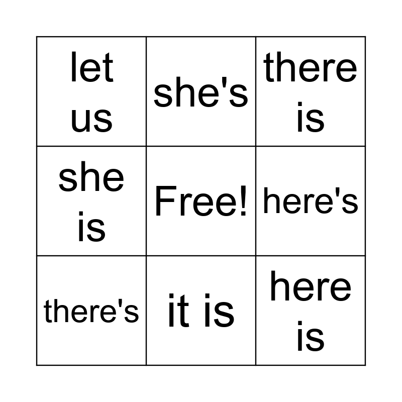 This bingo card has a free space and 10 words: it is, there is, let us, here is, she is, there's, she's, let's, here's and it's.