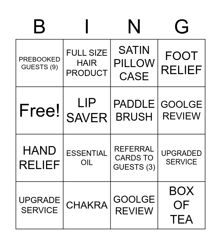 This bingo card has 16 words: CHAKRA, UPGRADED SERVICE, SATIN PILLOW CASE, PREBOOKED GUESTS (9), HAND RELIEF, FULL SIZE HAIR PRODUCT, REFERRAL CARDS TO GUESTS (3), GOOLGE REVIEW, Free!, LIP SAVER, UPGRADE SERVICE, FOOT RELIEF, ESSENTIAL OIL, GOOLGE REVIEW, PADDLE BRUSH and BOX OF TEA.