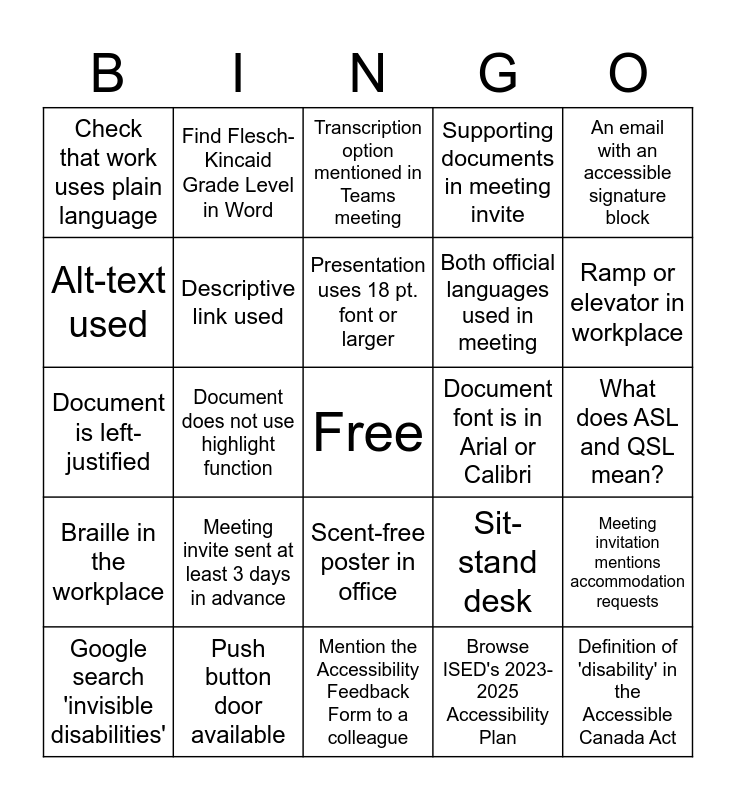 This bingo card has a free space and 24 words: Meeting invite sent at least 3 days in advance, Push button door available, Presentation uses 18 pt. font or larger, Google search 'invisible disabilities', An email with an accessible signature block, Check that work uses plain language, Alt-text used, Find Flesch-Kincaid Grade Level in Word, Document font is in Arial or Calibri, Scent-free poster in office, Both official languages used in meeting, Document is left-justified, Sit-stand desk, Meeting invitation mentions accommodation requests, Descriptive link used, Browse ISED's 2023-2025 Accessibility Plan, What does ASL and QSL mean?, Transcription option mentioned in Teams meeting, Ramp or elevator in workplace, Document does not use highlight function, Definition of 'disability' in the Accessible Canada Act, Braille in the workplace, Supporting documents in meeting invite and Mention the Accessibility Feedback Form to a colleague.