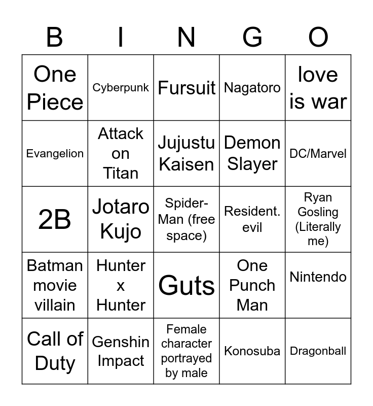 This bingo card has a free space and 47 words: Akatsuki, Genshin Impact, LoL/Arcane, Batman, DC/Marvel, Batman movie villain, Cyberpunk, JoJo’s, Demon Slayer, Dragonball, Evangelion, Attack on Titan, Konosuba, Nintendo, mechanical element, Michael Myers, Jujustu Kaisen, One Punch Man, Naruto, One Piece, Hunter x Hunter, Spy x Family, Nagatoro, love is war, Patrick Bateman, Jotaro Kujo, Guts, Snake, Ryan Gosling (Literally me), 2B, Walter White, Spike Speigel, Saul Goodman, Sword Art Online, Dragon maid, Darling in the Franxxx, Female character portrayed by male, Male character portrayed by Female, Halo, Call of Duty, Star Wars, Fursuit, Resident. evil, Chainsaw Man, Star Trek, Ghostbusters and Bocchi the Rock.