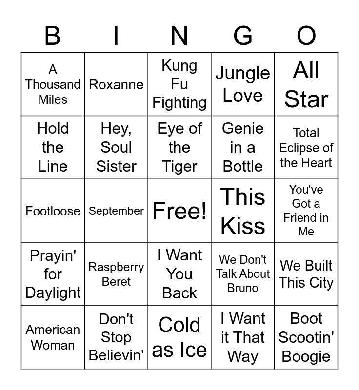 This bingo card has a free space and 24 words: Raspberry Beret, Don't Stop Believin', Eye of the Tiger, American Woman, All Star, A Thousand Miles, Hold the Line, Roxanne, This Kiss, I Want You Back, Genie in a Bottle, Footloose, We Don't Talk About Bruno, We Built This City, Hey, Soul Sister, I Want it That Way, You've Got a Friend in Me, Kung Fu Fighting, Total Eclipse of the Heart, September, Boot Scootin' Boogie, Prayin' for Daylight, Jungle Love and Cold as Ice.
