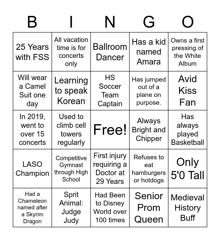 This bingo card has a free space and 24 words: Competitive Gymnast through High School, Sprit Animal: Judge Judy, HS Soccer Team Captain, Had a Chameleon named after a Skyrim Dragon, Owns a first pressing of the White Album, 25 Years with FSS, Will wear a Camel Suit one day, All vacation time is for concerts only, Always Bright and Chipper, First injury requiring a Doctor at 29 Years, Has jumped out of a plane on purpose., In 2019, went to over 15 concerts, Refuses to eat hamburgers or hotdogs, Only 5'0 Tall, Learning to speak Korean, Senior Prom Queen, Has always played Basketball, Ballroom Dancer, Avid Kiss Fan, Used to climb cell towers regularly, Medieval History Buff, LASO Champion, Has a kid named Amara and Had Been to Disney World over 100 times.