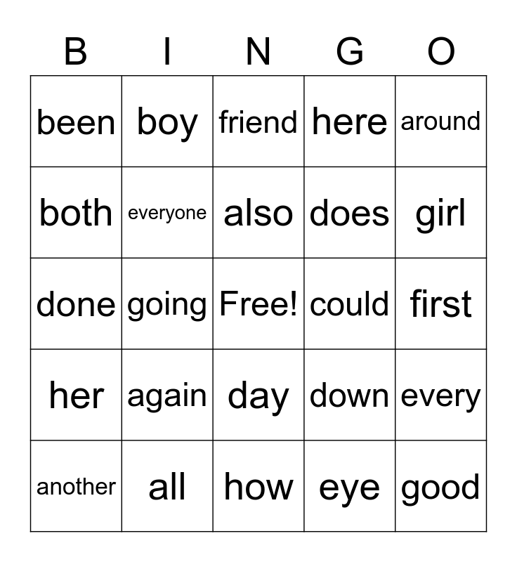 This bingo card has a free space and 24 words: again, all, also, another, around, been, both, boy, could, day, does, done, down, every, everyone, eye, first, friend, girl, going, good, her, here and how.