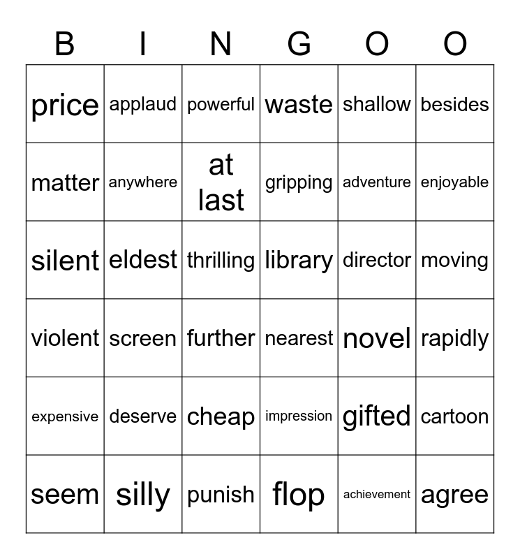This bingo card has 42 words: achievement, anywhere, crime, director, rapidly, screen, silent, within, powerful, moving, thrilling, gripping, enjoyable, shallow, silly, violent, cartoon, adventure, agree, applaud, besides, cheap, expensive, price, rise, seem, at last, caring, deserve, gifted, imagine, library, matter, novel, punish, further, nearest, eldest, impression, flop, waste and public.