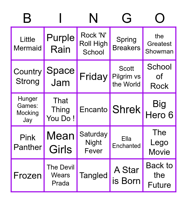 This bingo card has 55 words: Guardians of the Galaxy, Frozen, Avatar 2, Little Mermaid, Tangled, Pinocchio, Space Jam, 500 Days of Summer, Scott Pilgrim vs the World, the Breakfast Club, Spring Breakers, Perks of Being a Wallflower, Footloose, Pitch Perfect, Pitch Perfect 2, Pitch Perfect 3, the Greatest Showman, That Thing You Do !, Sing, Encanto, Shrek, Enchanted, Ella Enchanted, Rock 'N' Roll High School, Dazed & Confused, Friday, A Star is Born, Burlesque, Big Hero 6, The Lego Movie, 127 Hours, Hunger Games: Catching Fire, How to train your Dragon, Ted, Country Strong, Hunger Games: Mocking Jay, Hunger Games, Pink Panther, Back to the Future, The Croods, Purple Rain, Gone With the Wind, Top Gun: Maverick, Love Actually, Mean Girls, The Devil Wears Prada, Happy Feet, Dream Girls, Hairspray, School of Rock, Top Gun: Maverick, Ferris Bueller's Day Off, Elvis, Saturday Night Fever and Batman Forever.