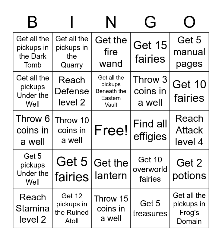This bingo card has a free space and 106 words: Ring the Eastern Bell, Ring the Western Bell, Get 5 manual pages, Get 10 manual pages, Get 15 manual pages, Get 20 manual pages, Get all the manual pages, Defeat the Guard Captain, Defeat the Garden Knight, Defeat Eastern Vault guardian, Defeat the Librarian, Defeat the Scavenger, Defeat the Heir, Get the stick, Get the sword, Get the shield, Get the fire wand, Get the ice dagger, Get the hourglass, Get the shotgun, Get the lantern, Get the magic orb, Get the laurels, Change your whole look, Open the door in the mountains, Get 5 fairies, Get 10 fairies, Get 15 fairies, Get 20 fairies, Get 5 overworld fairies, Get 10 overworld fairies, Get 5 treasures, Get the 6 overworld treasures, Get all the treasures, Get 10 East Forest pickups, Get all the East Forest pickups, Get 5 Eastern Vault pickups, Get all the Eastern Vault pickups, Get all the pickups Beneath the Eastern Vault, Get 5 pickups in the West Garden, Get 10 pickups in the West Garden, Get 15 pickups in the West Garden, Get all the pickups in the West Garden, Get 5 pickups Under the Well, Get 10 pickups Under the Well, Get all the pickups Under the Well, Get 3 pickups in the Dark Tomb, Get all the pickups in the Dark Tomb, Get 5 pickups in Frog's Domain, Get all the pickups in Frog's Domain, Get 6 pickups in the Ruined Atoll, Get 12 pickups in the Ruined Atoll, Get all pickups in the Ruined Atoll, Take the portal to the Great Library, Get all the pickups in the Great Library, Get 5 pickups in the Quarry, Get 10 pickups in the Quarry, Get 15 pickups in the Quarry, Get 20 pickups in the Quarry, Get all the pickups in the Quarry, Get 5 pickups in the Ziggurat, Get all pickups in the Ziggurat, Get 5 pickups in the Swamp, Get 10 pickups in the Swamp, Get 15 pickups in the Swamp, Get all the pickups in the Swamp, Get 5 pickups in the Cathedral, Get all the pickups in the Cathedral, Throw 3 coins in a well, Throw 6 coins in a well, Throw 10 coins in a well, Throw 15 coins in a well, Find 5 ability cards, Find 10 ability cards, Find all (16) the ability cards, Get 1 free dynamite, Get 2 free dynamites, Get 3 free dynamites, Get 1 free fire bomb, Get 2 free fire bombs, Get 3 free fire bombs, Get 1 free ice bombs, Get 2 free ice bombs, Get 3 free ice bombs, Find 3 effigies, Find 6 effigies, Find all effigies, Open 1 passage with explosives, Open 2 passages with explosives, Open 3 passages with explosives, Hold 250 currency at once, Hold 500 currency at once, Hold 750 currency at once, Hold 1000 currency at once, Get the 4 skulls treasure in the swamp, Get 2 potions, Get 4 potions, Get 6 potions, Reach Attack level 2, Reach Attack level 4, Reach Defense level 2, Reach Defense level 4, Reach Health level 2, Reach Health level 4, Reach Stamina level 2 and Reach Magic level 2.