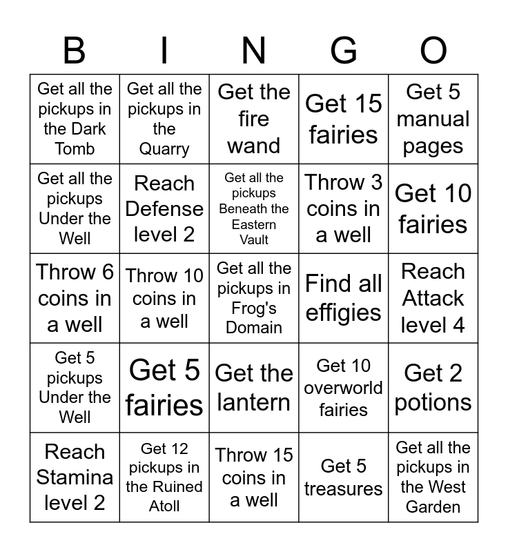 This bingo card has 106 words: Ring the Eastern Bell, Ring the Western Bell, Get 5 manual pages, Get 10 manual pages, Get 15 manual pages, Get 20 manual pages, Get all the manual pages, Defeat the Guard Captain, Defeat the Garden Knight, Defeat Eastern Vault guardian, Defeat the Librarian, Defeat the Scavenger, Defeat the Heir, Get the stick, Get the sword, Get the shield, Get the fire wand, Get the ice dagger, Get the hourglass, Get the shotgun, Get the lantern, Get the magic orb, Get the laurels, Change your whole look, Open the door in the mountains, Get 5 fairies, Get 10 fairies, Get 15 fairies, Get 20 fairies, Get 5 overworld fairies, Get 10 overworld fairies, Get 5 treasures, Get the 6 overworld treasures, Get all the treasures, Get 10 East Forest pickups, Get all the East Forest pickups, Get 5 Eastern Vault pickups, Get all the Eastern Vault pickups, Get all the pickups Beneath the Eastern Vault, Get 5 pickups in the West Garden, Get 10 pickups in the West Garden, Get 15 pickups in the West Garden, Get all the pickups in the West Garden, Get 5 pickups Under the Well, Get 10 pickups Under the Well, Get all the pickups Under the Well, Get 3 pickups in the Dark Tomb, Get all the pickups in the Dark Tomb, Get 5 pickups in Frog's Domain, Get all the pickups in Frog's Domain, Get 6 pickups in the Ruined Atoll, Get 12 pickups in the Ruined Atoll, Get all pickups in the Ruined Atoll, Take the portal to the Great Library, Get all the pickups in the Great Library, Get 5 pickups in the Quarry, Get 10 pickups in the Quarry, Get 15 pickups in the Quarry, Get 20 pickups in the Quarry, Get all the pickups in the Quarry, Get 5 pickups in the Ziggurat, Get all pickups in the Ziggurat, Get 5 pickups in the Swamp, Get 10 pickups in the Swamp, Get 15 pickups in the Swamp, Get all the pickups in the Swamp, Get 5 pickups in the Cathedral, Get all the pickups in the Cathedral, Throw 3 coins in a well, Throw 6 coins in a well, Throw 10 coins in a well, Throw 15 coins in a well, Find 5 ability cards, Find 10 ability cards, Find all (16) the ability cards, Get 1 free dynamite, Get 2 free dynamites, Get 3 free dynamites, Get 1 free fire bomb, Get 2 free fire bombs, Get 3 free fire bombs, Get 1 free ice bombs, Get 2 free ice bombs, Get 3 free ice bombs, Find 3 effigies, Find 6 effigies, Find all effigies, Open 1 passage with explosives, Open 2 passages with explosives, Open 3 passages with explosives, Hold 250 currency at once, Hold 500 currency at once, Hold 750 currency at once, Hold 1000 currency at once, Get the 4 skulls treasure in the swamp, Get 2 potions, Get 4 potions, Get 6 potions, Reach Attack level 2, Reach Attack level 4, Reach Defense level 2, Reach Defense level 4, Reach Health level 2, Reach Health level 4, Reach Stamina level 2 and Reach Magic level 2.