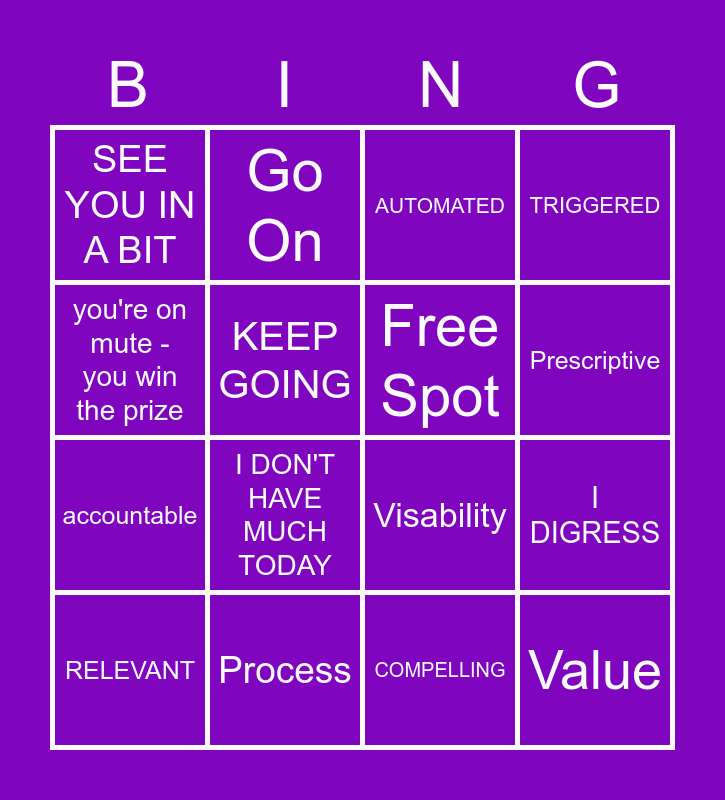 This bingo card has 17 words: COMPELLING, RELEVANT, AUTOMATED, SEE YOU IN A BIT, I DON'T HAVE MUCH TODAY, TRIGGERED, I DIGRESS, Free Spot, Prescriptive, KEEP GOING, Process, Visability, you're on mute - you win the prize, Go On, accountable, Alignment and Value.