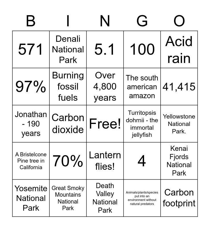 This bingo card has a free space and 36 words: Honey mushroom, Blue whale, African bush elephant, Burning fossil fuels, 4, A Bristelcone Pine tree in California, Over 4,800 years, 1%, Acid rain, Lichen, Carbon dioxide, 100, Amazon rainforest, Turritopsis dohrnii - the immortal jellyfish, 41,415, 571, indicator species, 70%, Carbon footprint, 5.1, Yellowstone National Park., Kenai Fjords National Park, Great Smoky Mountains National Park, Yosemite National Park, Death Valley National Park, Denali National Park, Jonathan - 190 years, Amphibians, The south american amazon, 97%, The nile, Lake biakal, Animals/plants/species put into an environment without natural predators, Lantern flies!, Bass and bluegill and White-tailed deer.