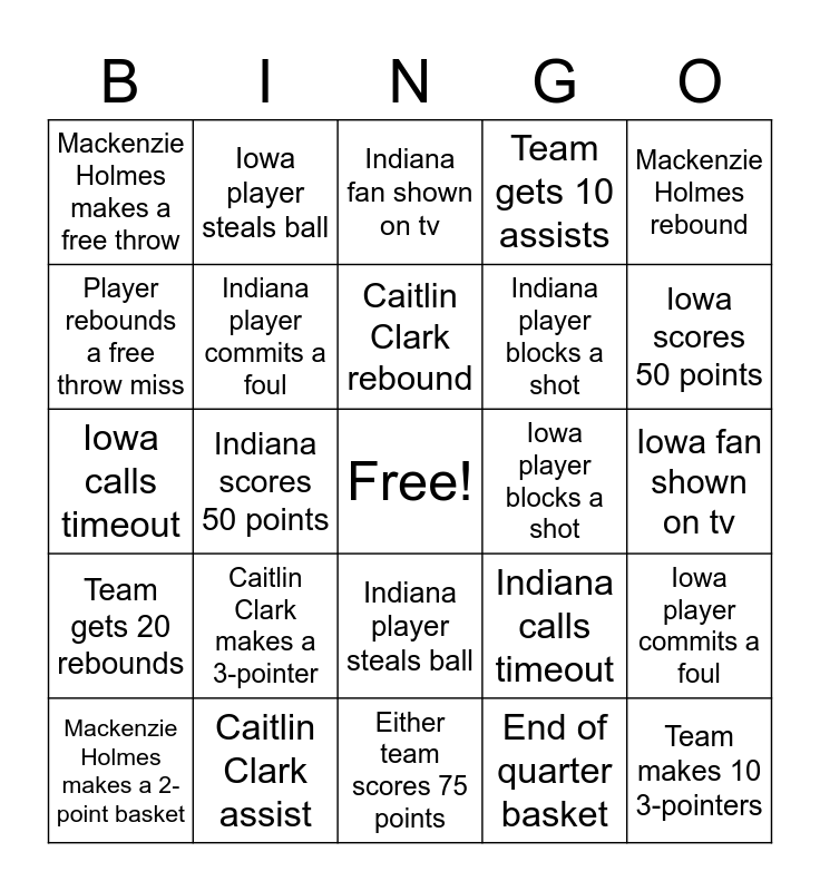 This bingo card has a free space and 24 words: Caitlin Clark makes a 3-pointer, Caitlin Clark assist, Caitlin Clark rebound, Mackenzie Holmes makes a 2-point basket, Mackenzie Holmes rebound, Mackenzie Holmes makes a free throw, Player rebounds a free throw miss, Iowa player steals ball, Iowa player blocks a shot, Indiana player steals ball, Indiana player blocks a shot, Iowa calls timeout, Indiana calls timeout, Iowa player commits a foul, Indiana player commits a foul, End of quarter basket, Iowa fan shown on tv, Indiana fan shown on tv, Iowa scores 50 points, Indiana scores 50 points, Team makes 10 3-pointers, Team gets 20 rebounds, Team gets 10 assists and Either team scores 75 points.