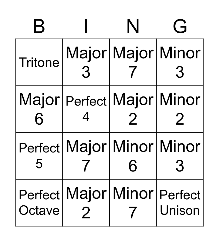 This bingo card has 16 words: Major 2, Minor 3, Major 7, Tritone, Perfect 5, Major 3, Minor 6, Minor 7, Major 6, Perfect 4, Perfect Octave, Minor 3, Major 7, Minor 2, Major 2 and Perfect Unison.