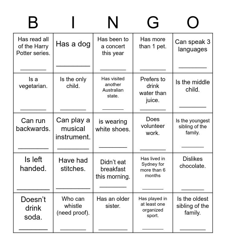 This bingo card has 25 words: Have had stitches. _________, Has an older sister. _________, Has visited another Australian state. ________, Doesn’t drink soda. _______, Can speak 3 languages ________, Has read all of the Harry Potter series. ________, Is a vegetarian. ________, Has a dog ________, Does volunteer work. ________, Didn’t eat breakfast this morning. ________, Prefers to drink water than juice. ________, Can run backwards. ________, Has lived in Sydney for more than 6 months ________, Dislikes chocolate. _______, Is the only child. ________, Is the oldest sibling of the family. ________, Is the youngest sibling of the family. ________, Has been to a concert this year ________, Is the middle child. ________, Can play a musical instrument. ________, is wearing white shoes. ________, Who can whistle (need proof). ________, Is left handed. ________, Has more than 1 pet. ________ and Has played in at least one organized sport. ________.