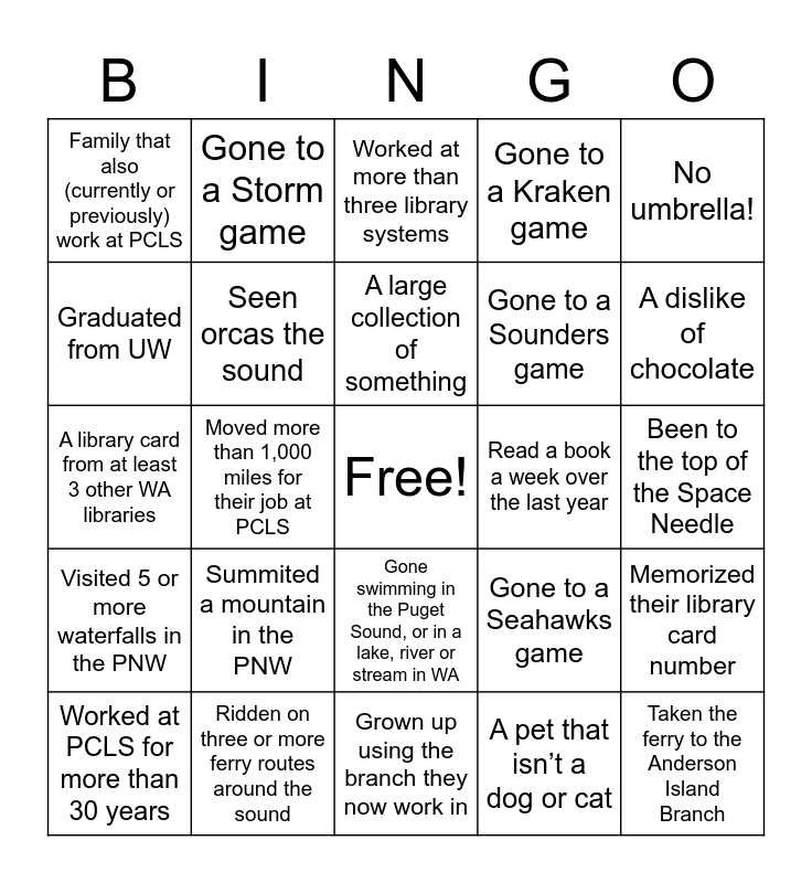 This bingo card has a free space and 29 words: Worked at PCLS for more than 30 years, Worked at PCLS for less than 3 months, Moved more than 1,000 miles for their job at PCLS, Visited every branch in the system, Family that also (currently or previously) work at PCLS, Worked at more than three library systems, Seen orcas the sound, Summited a mountain in the PNW, Read a book a week over the last year, Ridden on three or more ferry routes around the sound, Been to the top of the Space Needle, Taken the ferry to the Anderson Island Branch, Grown up using the branch they now work in, A pet that isn’t a dog or cat, A dislike of chocolate, A PNW bumper sticker, Gone swimming in the Puget Sound, or in a lake, river or stream in WA, Visited 5 or more waterfalls in the PNW, No umbrella!, A library card from at least 3 other WA libraries, Gone to a Seahawks game, Gone to a Mariners game, Gone to a Sounders game, Graduated from UW, Gone to a Kraken game, Gone to a Storm game, Memorized their library card number, A large collection of something and Met their significant other in a library setting.