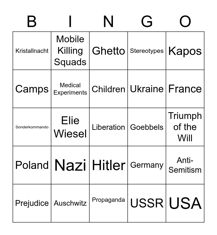 This bingo card has 30 words: Auschwitz, Treblinka, Elie Wiesel, Night, Kristallnacht, Ghetto, Medical Experiments, Hitler, Goebbels, Propaganda, Triumph of the Will, Liberation, USSR, USA, France, Great Britain, Germany, Poland, Nazi, Kapos, Sonderkommando, Extermination, Mobile Killing Squads, Ukraine, Camps, Stereotypes, Anti-Semitism, Prejudice, Children and Railroads.