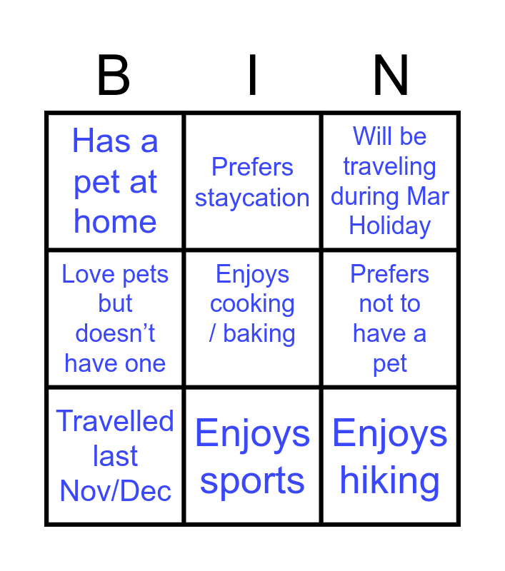 This bingo card has 9 words: Travelled last Nov/Dec, Will be traveling during Mar Holiday, Prefers staycation, Love pets but doesn’t have one, Has a pet at home, Prefers not to have a pet, Enjoys cooking / baking, Enjoys hiking and Enjoys sports.