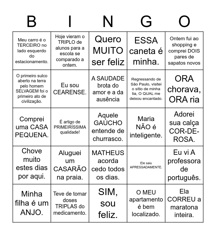 This bingo card has 25 words: Chove muito estes dias por aqui., Teve de tomar doses TRIPLAS do medicamento., Aquele GAÚCHO entende de churrasco., O MEU apartamento é bem localizado., Ontem fui ao shopping e comprei DOIS pares de sapatos novos, Meu carro é o TERCEIRO no lado esquerdo do estacionamento., Hoje vieram o TRIPLO de alunos para a escola se comparado a ontem., Quero MUITO ser feliz, Maria NÃO é inteligente., Eu vi A professora de português., O primeiro sulco aberto na terra pelo homem SELVAGEM foi o primeiro ato de civilização., Eu sou CEARENSE., SIM, sou feliz., Ele saiu APRESSADAMENTE., ORA chorava, ORA ria, Minha filha é um ANJO., É artigo de PRIMEIRÍSSIMA qualidade!, A SAUDADE brota do amor e a da ausência, Regressando de São Paulo, visitei o sítio de minha tia, O QUAL me deixou encantado., Adorei sua calça COR-DE-ROSA., Comprei uma CASA PEQUENA., Aluguei um CASARÃO na praia., MATHEUS acorda cedo todos os dias., ESSA caneta é minha. and Ela CORREU a maratona inteira..