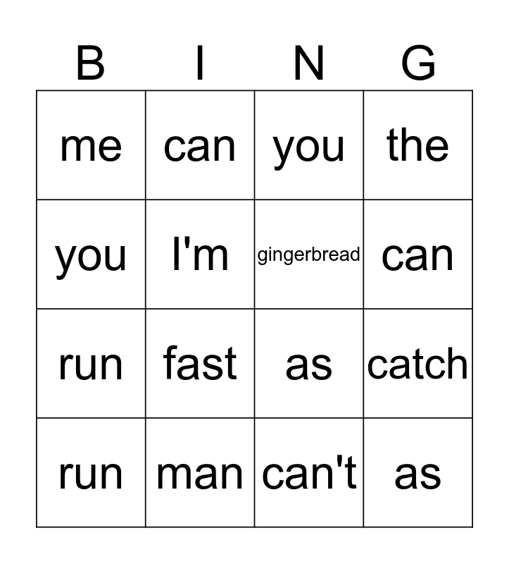 This bingo card has a free space and 15 words: run, as, you, me, can, you, fast, can't, I'm, run, catch, the, gingerbread, can and man.