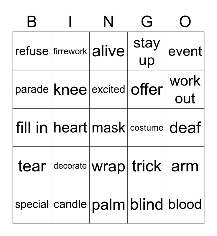 This bingo card has a free space and 24 words: decorate, candle, excited, special, event, refuse, parade, firrework, costume, wrap, offer, fill in, trick, arm, knee, blind, deaf, alive, work out, heart, blood, tear, stay up and palm.