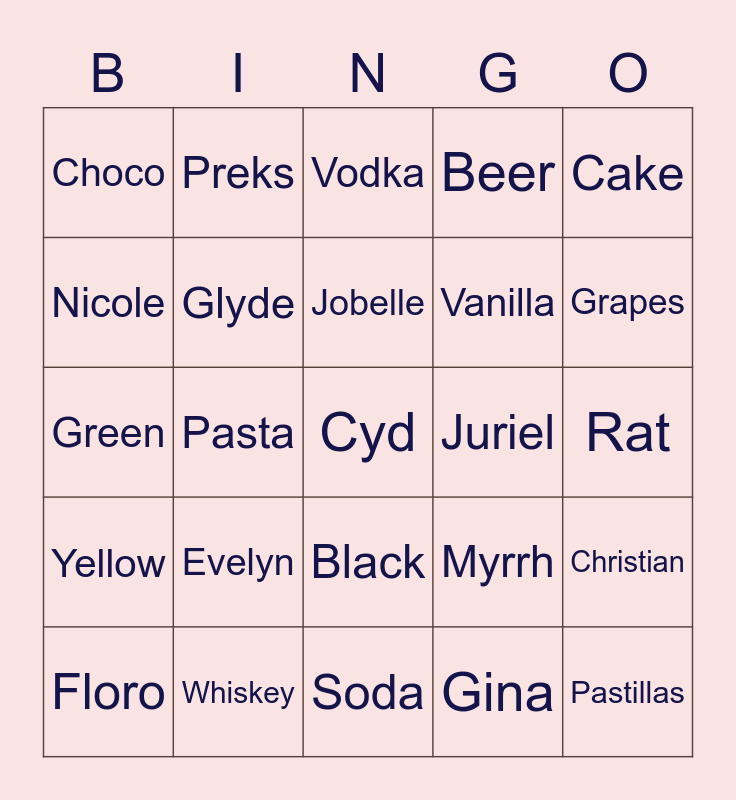 This bingo card has 53 words: Bern, Cyd, Jermyn, Gina, Evelyn, Rox, Preks, Chuckie, Nicole, Julie, Glyde, Joshua, Christian, Myrrh, Christine, Floro, Jobelle, Juriel, Ramel, Cake, Pasta, Pastillas, Vanilla, Choco, Fudge, Whiskey, Tequila, Soju, Mango, Grapes, Winter, Summer, Fall, Autumn, Trixie, Rigel, Beer, Soda, Vodka, Juice, Cat, Dog, Rat, Fish, Bird, Black, White, Red, Green, Yellow, Cebu, Bohol and Leyte.