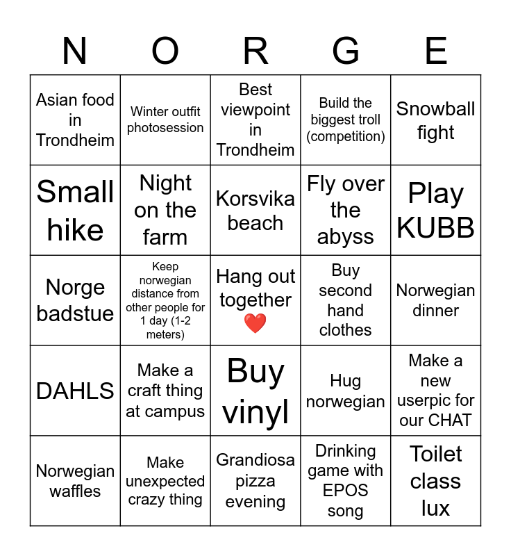 This bingo card has a free space and 24 words: Make a craft thing at campus, Make unexpected crazy thing, Korsvika beach, Norwegian waffles, Snowball fight, Asian food in Trondheim, Small hike, Winter outfit photosession, Buy second hand clothes, Buy vinyl, Fly over the abyss, Norge badstue, Hug norwegian, Make a new userpic for our CHAT, Night on the farm, Drinking game with EPOS song, Norwegian dinner, Best viewpoint in Trondheim, Play KUBB, Keep norwegian distance from other people for 1 day (1-2 meters), Toilet class lux, DAHLS, Build the biggest troll (competition) and Grandiosa pizza evening.