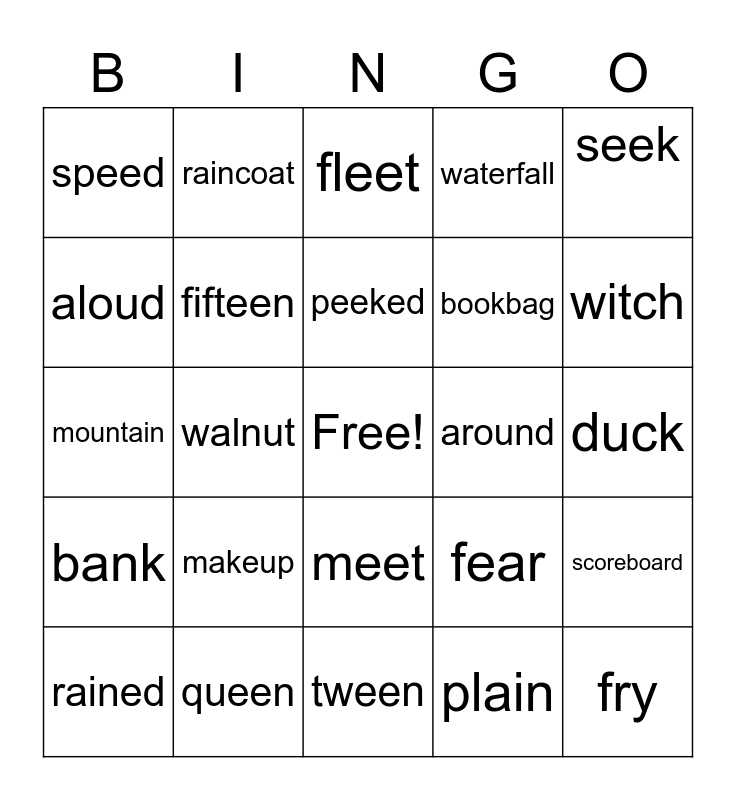 This bingo card has a free space and 24 words: makeup, queen, peeked, rained, seek, speed, aloud, raincoat, around, meet, bookbag, mountain, fear, scoreboard, fifteen, plain, duck, fleet, witch, walnut, fry, bank, waterfall and tween.