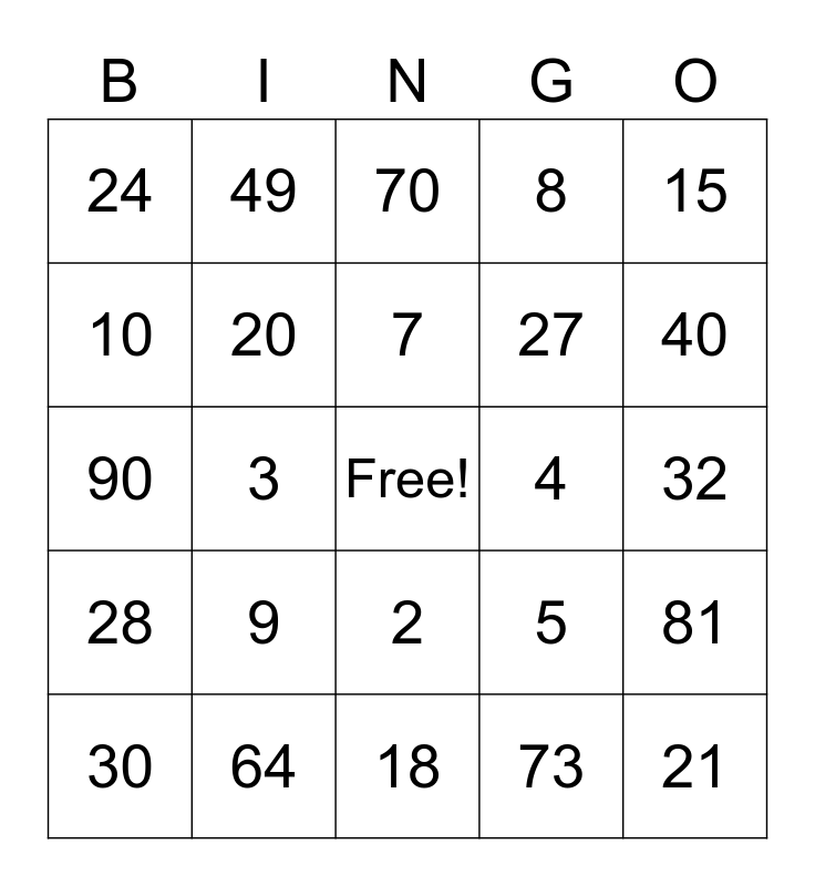 This bingo card has a free space and 39 words: 1, 6, 12, 20, 30, 2, 7, 14, 15, 28, 3, 8, 21, 32, 4, 9, 16, 24, 36, 5, 10, 18, 27, 40, 35, 42, 48, 54, 60, 49, 56, 63, 70, 64, 73, 80, 81, 90 and 100.