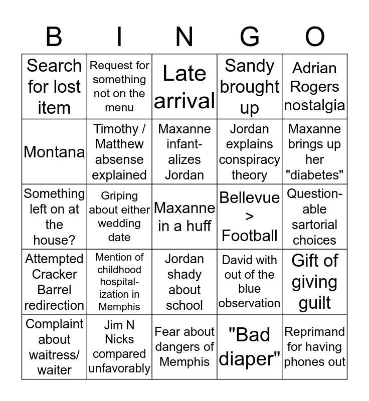 This bingo card has a free space and 24 words: Mention of childhood hospital-ization in Memphis, Jim N Nicks compared unfavorably, Maxanne infant- alizes Jordan, Complaint about waitress/ waiter, Adrian Rogers nostalgia, Search for lost item, Montana, Request for something not on the menu, Bellevue > Football, Jordan shady about school, Jordan explains conspiracy theory, Something left on at the house?, David with out of the blue observation, Gift of giving guilt, Timothy / Matthew absense explained, "Bad diaper", Question-able sartorial choices, Late arrival, Maxanne brings up her "diabetes", Griping about either wedding date, Reprimand for having phones out, Attempted Cracker Barrel redirection, Sandy brought up and Fear about dangers of Memphis.