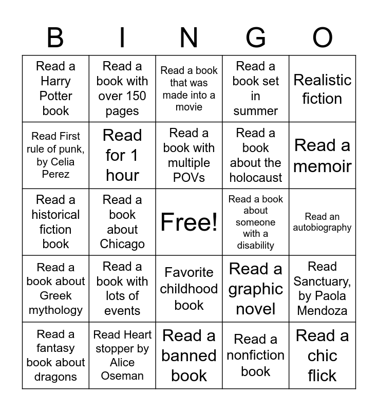 This bingo card has a free space and 24 words: Read a book with lots of events, Read Heart stopper by Alice Oseman, Read a book with multiple POVs, Read a fantasy book about dragons, Realistic fiction, Read a Harry Potter book, Read First rule of punk, by Celia Perez, Read a book with over 150 pages, Read a book about someone with a disability, Favorite childhood book, Read a book about the holocaust, Read a historical fiction book, Read a graphic novel, Read Sanctuary, by Paola Mendoza, Read for 1 hour, Read a nonfiction book, Read an autobiography, Read a book that was made into a movie, Read a memoir, Read a book about Chicago, Read a chic flick, Read a book about Greek mythology, Read a book set in summer and Read a banned book.