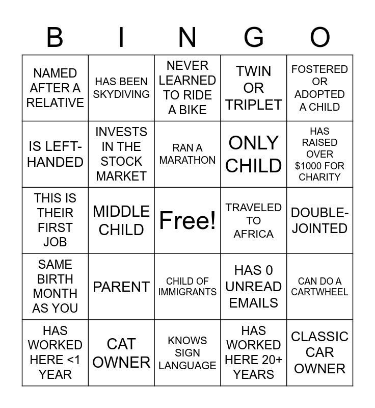 This bingo card has a free space and 63 words: CERTIFIED SCUBA DIVER, PRACTICES YOGA, CAN BENCH PRESS 150+ LBS, CAN DO A CARTWHEEL, GARDENER, HAS BEEN IN A HOT AIR BALLOON, HAS BEEN SKYDIVING, HAS BUNGEE JUMPED, RAN A MARATHON, BIRTHDAY IS ON A HOLIDAY, CHILD OF IMMIGRANTS, COMES FROM A BIG FAMILY (4+ SIBLINGS), DOUBLE-JOINTED, FOSTERED OR ADOPTED A CHILD, GRANDPARENT, IS LEFT-HANDED, MIDDLE CHILD, NAMED AFTER A RELATIVE, OLDEST CHILD, ONLY CHILD, PARENT, SAME BIRTH MONTH AS YOU, TWIN OR TRIPLET, YOUNGEST CHILD, ATTENDED A CONCERT THIS YEAR, BREWS BEER, CAN BAKE A CAKE FROM SCRATCH, DOES STAND UP COMEDY, DRINKS 3+ CUPS COFFEE A DAY, GOES ALL-OUT ON HOLIDAY DECORATING, PLAYS AN INSTRUMENT, SPEAKS 2+ LANGUAGES, SCREAMS DURING SCARY MOVIES, BIKES TO WORK, HAS RAISED OVER $1000 FOR CHARITY, HAS WORKED HERE <1 YEAR, HAS WORKED HERE 10+ YEARS, HAS WORKED HERE 20+ YEARS, HAS WORKED HERE 5+ YEARS, INVESTS IN THE STOCK MARKET, THIS IS THEIR FIRST JOB, TRAVELED TO AFRICA, VISITED 4+ CONTINENTS, CAN DRIVE STICK, CLASSIC CAR OWNER, CAT OWNER, DOG OWNER, HAS 0 UNREAD EMAILS, HAS A HIDDEN TALENT, HAS BEEN TO THE OLYMPICS, HAS AN UNUSUAL FAMILY TRADITION, KNOWS SIGN LANGUAGE, KNOWS THE WHOLE PERIODIC TABLE, LIKES PINEAPPLE ON PIZZA, NEVER FLOWN ON AN AIRPLANE, NEVER LEARNED TO RIDE A BIKE, LIVED IN ANOTHER COUNTRY, OWNS SAME CAR BRAND AS YOU, QUIT A BAD HABIT RECENTLY, SENDS CHRISTMAS CARDS, READS NEWSPAPERS (PRINT, NOT DIGITAL), SPELLING BEE CHAMP and WEARING FUNNY SOCKS.