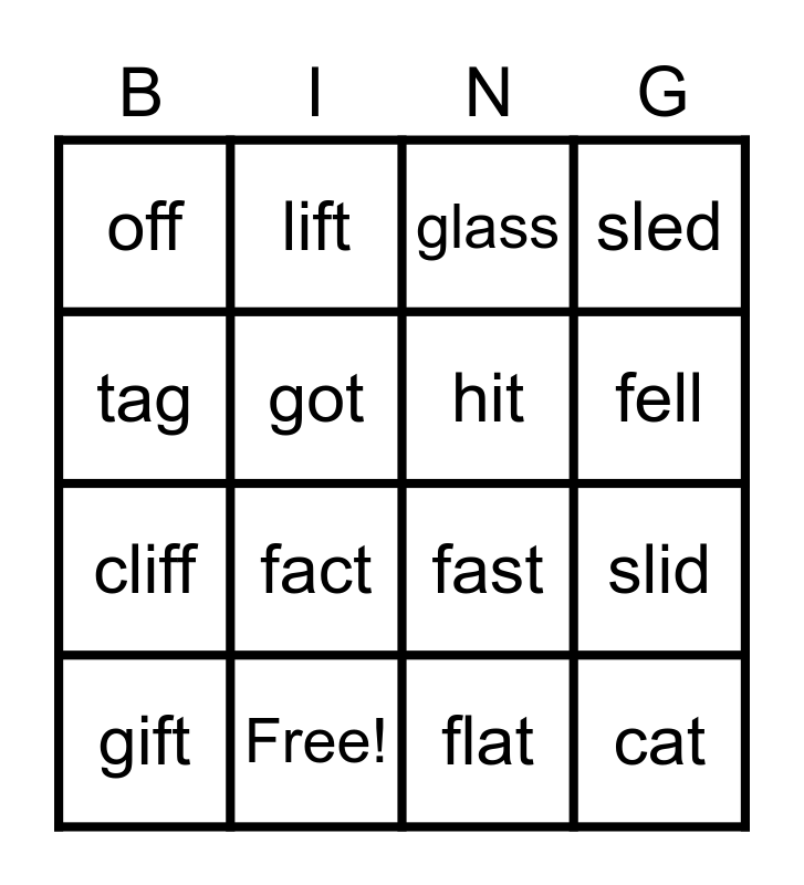 This bingo card has 16 words: Free!, slid, glass, off, cliff, lift, fast, flat, tag, got, gift, sled, fact, fell, hit and cat.