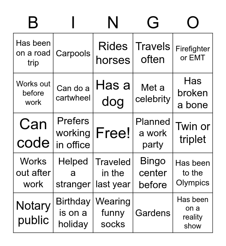 This bingo card has a free space and 25 words: Helped a stranger, Wearing funny socks, Has a dog, Notary public, Firefighter or EMT, Has been on a road trip, Works out before work, Carpools, Planned a work party, Traveled in the last year, Met a celebrity, Can code, Bingo center before, Has been to the Olympics, Can do a cartwheel, Went viral online, Twin or triplet, Rides horses, Has broken a bone, Prefers working in office, Has been on a reality show, Birthday is on a holiday, Works out after work, Travels often and Gardens.