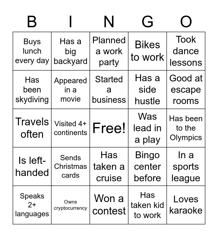 This bingo card has a free space and 25 words: Sends Christmas cards, Won a contest, Started a business, Speaks 2+ languages, Took dance lessons, Buys lunch every day, Has been skydiving, Has a big backyard, Was lead in a play, Has taken a cruise, Has a side hustle, Travels often, Bingo center before, In a sports league, Appeared in a movie, Knows martial arts, Has been to the Olympics, Planned a work party, Good at escape rooms, Visited 4+ continents, Loves karaoke, Owns cryptocurrency, Is left-handed, Bikes to work and Has taken kid to work.