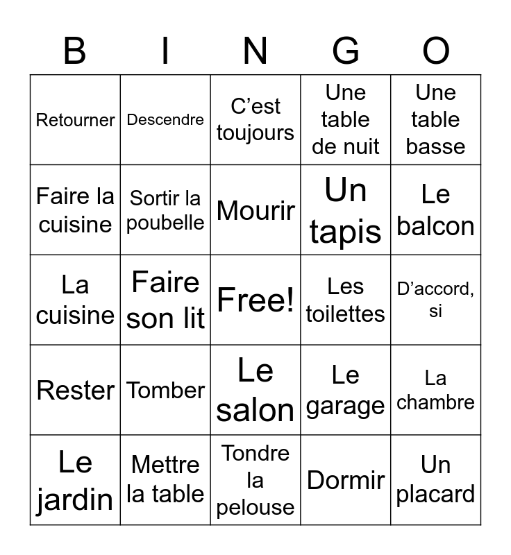 This bingo card has a free space and 24 words: Tomber, Mettre la table, Mourir, Le jardin, Une table basse, Retourner, Faire la cuisine, Descendre, Les toilettes, Le salon, Un tapis, La cuisine, Le garage, La chambre, Sortir la poubelle, Dormir, D’accord, si, C’est toujours, Le balcon, Faire son lit, Un placard, Rester, Une table de nuit and Tondre la pelouse.