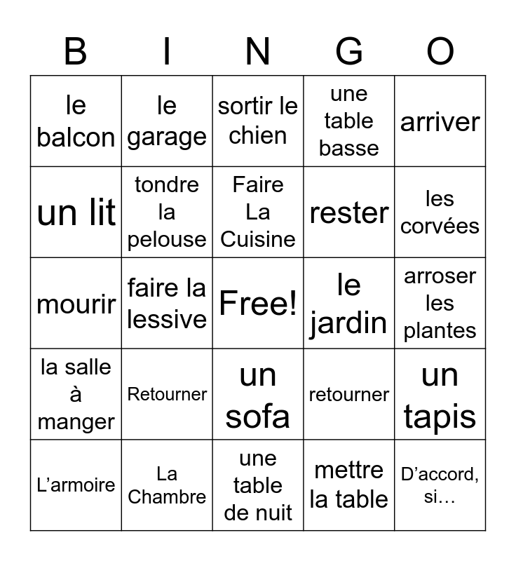 This bingo card has a free space and 24 words: Retourner, La Chambre, Faire La Cuisine, L’armoire, arriver, le balcon, un lit, le garage, le jardin, un sofa, rester, mourir, retourner, un tapis, tondre la pelouse, mettre la table, arroser les plantes, sortir le chien, les corvées, faire la lessive, D’accord, si…, la salle à manger, une table basse and une table de nuit.