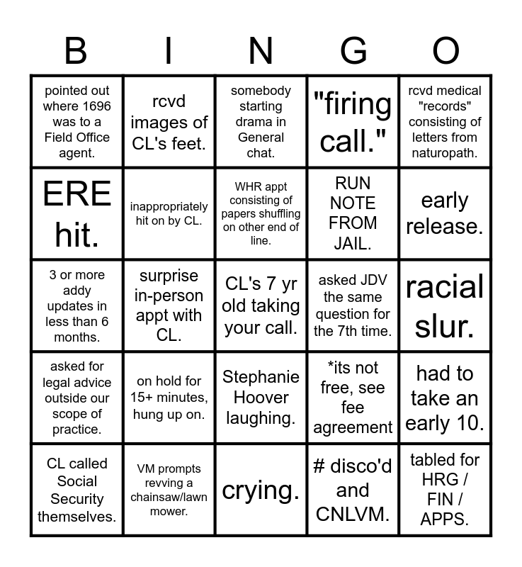 This bingo card has 25 words: on hold for 15+ minutes, hung up on., crying., WHR appt consisting of papers shuffling on other end of line., CL called Social Security themselves., rcvd medical "records" consisting of letters from naturopath., pointed out where 1696 was to a Field Office agent., ERE hit., rcvd images of CL's feet., asked JDV the same question for the 7th time., Stephanie Hoover laughing., RUN NOTE FROM JAIL., 3 or more addy updates in less than 6 months., *its not free, see fee agreement, had to take an early 10., inappropriately hit on by CL., tabled for HRG / FIN / APPS., racial slur., somebody starting drama in General chat., early release., surprise in-person appt with CL., CL's 7 yr old taking your call., VM prompts revving a chainsaw/lawn mower., asked for legal advice outside our scope of practice., "firing call." and # disco'd and CNLVM..