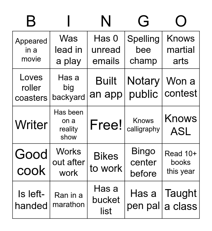 This bingo card has a free space and 25 words: Works out after work, Has a bucket list, Built an app, Is left-handed, Knows martial arts, Appeared in a movie, Loves roller coasters, Was lead in a play, Knows calligraphy, Bikes to work, Notary public, Writer, Bingo center before, Read 10+ books this year, Has a big backyard, Prefers working in office, Knows ASL, Has 0 unread emails, Won a contest, Has been on a reality show, Taught a class, Ran in a marathon, Good cook, Spelling bee champ and Has a pen pal.