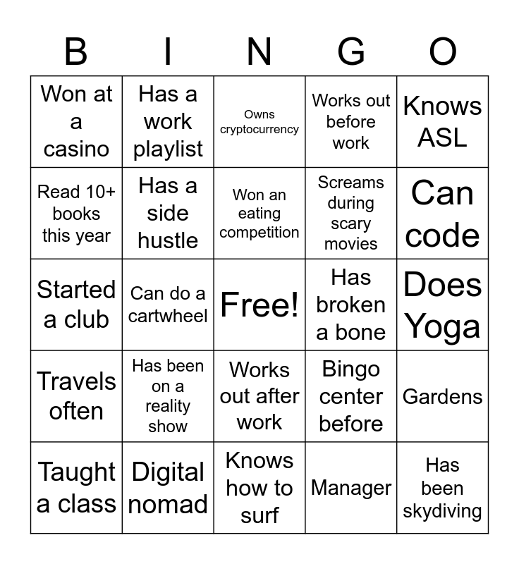 This bingo card has a free space and 25 words: Has been on a reality show, Knows how to surf, Won an eating competition, Taught a class, Knows ASL, Won at a casino, Read 10+ books this year, Has a work playlist, Has broken a bone, Works out after work, Screams during scary movies, Started a club, Bingo center before, Gardens, Has a side hustle, Twin or triplet, Does Yoga, Owns cryptocurrency, Can code, Can do a cartwheel, Has been skydiving, Digital nomad, Travels often, Works out before work and Manager.