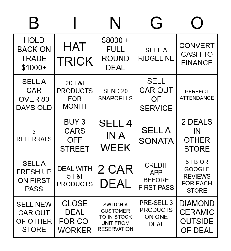 This bingo card has 25 words: DEAL WITH 5 F&I PRODUCTS, SWITCH A CUSTOMER TO IN-STOCK UNIT FROM RESERVATION, SEND 20 SNAPCELLS, SELL NEW CAR OUT OF OTHER STORE, CONVERT CASH TO FINANCE, HOLD BACK ON TRADE $1000+, SELL A CAR OVER 80 DAYS OLD, HAT TRICK, SELL A SONATA, 2 CAR DEAL, SELL CAR OUT OF SERVICE, 3 REFERRALS, CREDIT APP BEFORE FIRST PASS, 5 FB OR GOOGLE REVIEWS FOR EACH STORE, 20 F&I PRODUCTS FOR MONTH, DIAMOND CERAMIC OUTSIDE OF DEAL, 2 DEALS IN OTHER STORE, $8000 + FULL ROUND DEAL, PERFECT ATTENDANCE, BUY 3 CARS OFF STREET, SELL 4 IN A WEEK, CLOSE DEAL FOR CO-WORKER, SELL A FRESH UP ON FIRST PASS, SELL A RIDGELINE and PRE-SELL 3 PRODUCTS ON ONE DEAL.