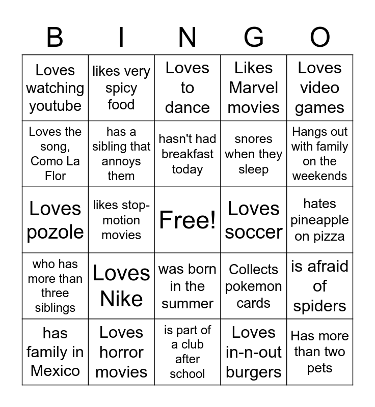 This bingo card has a free space and 24 words: Loves Nike, Loves horror movies, hasn't had breakfast today, has family in Mexico, Loves video games, Loves watching youtube, Loves the song, Como La Flor, likes very spicy food, Loves soccer, was born in the summer, snores when they sleep, Loves pozole, Collects pokemon cards, is afraid of spiders, has a sibling that annoys them, Loves in-n-out burgers, hates pineapple on pizza, Loves to dance, Hangs out with family on the weekends, likes stop-motion movies, Has more than two pets, who has more than three siblings, Likes Marvel movies and is part of a club after school.
