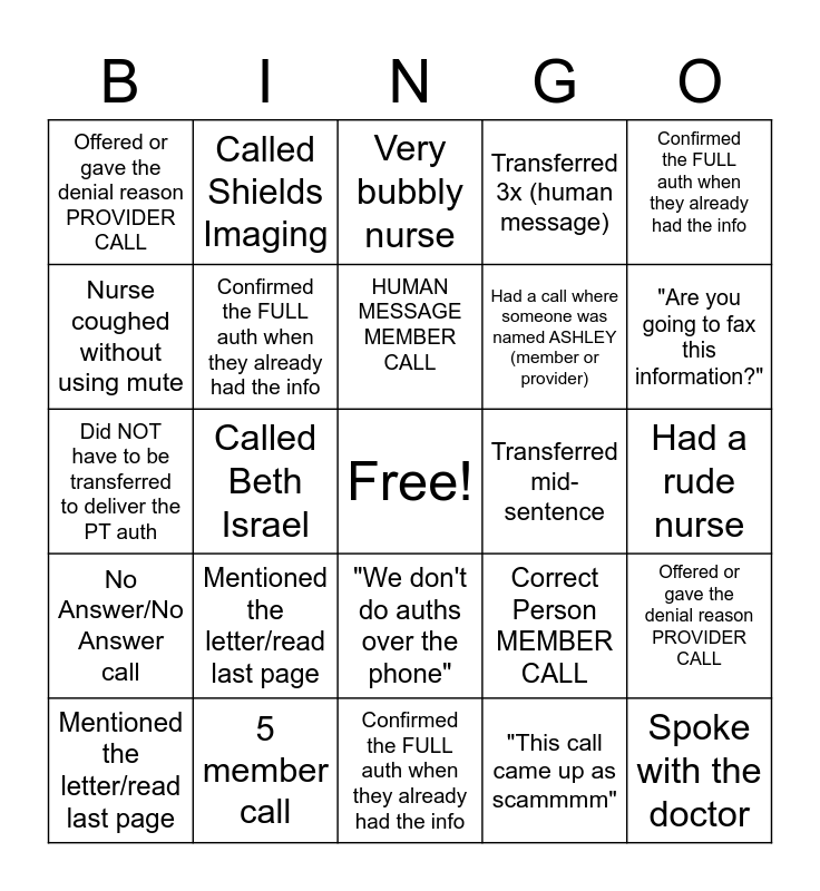 This bingo card has a free space and 24 words: Mentioned the letter/read last page, 5 member call, HUMAN MESSAGE MEMBER CALL, Mentioned the letter/read last page, Confirmed the FULL auth when they already had the info, Offered or gave the denial reason PROVIDER CALL, Nurse coughed without using mute, Called Shields Imaging, Transferred mid-sentence, "We don't do auths over the phone", Had a call where someone was named ASHLEY (member or provider), Did NOT have to be transferred to deliver the PT auth, Correct Person MEMBER CALL, Offered or gave the denial reason PROVIDER CALL, Confirmed the FULL auth when they already had the info, "This call came up as scammmm", Had a rude nurse, Very bubbly nurse, "Are you going to fax this information?", Called Beth Israel, Spoke with the doctor, No Answer/No Answer call, Transferred 3x (human message) and Confirmed the FULL auth when they already had the info.