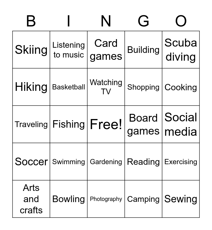 This bingo card has a free space and 24 words: Swimming, Bowling, Watching TV, Arts and crafts, Scuba diving, Skiing, Hiking, Listening to music, Board games, Gardening, Shopping, Traveling, Reading, Exercising, Basketball, Camping, Social media, Card games, Cooking, Fishing, Sewing, Soccer, Building and Photography.